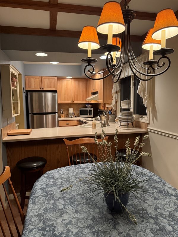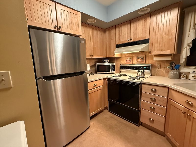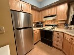 Kitchen has stove, refrigerator, dishwasher and microwave