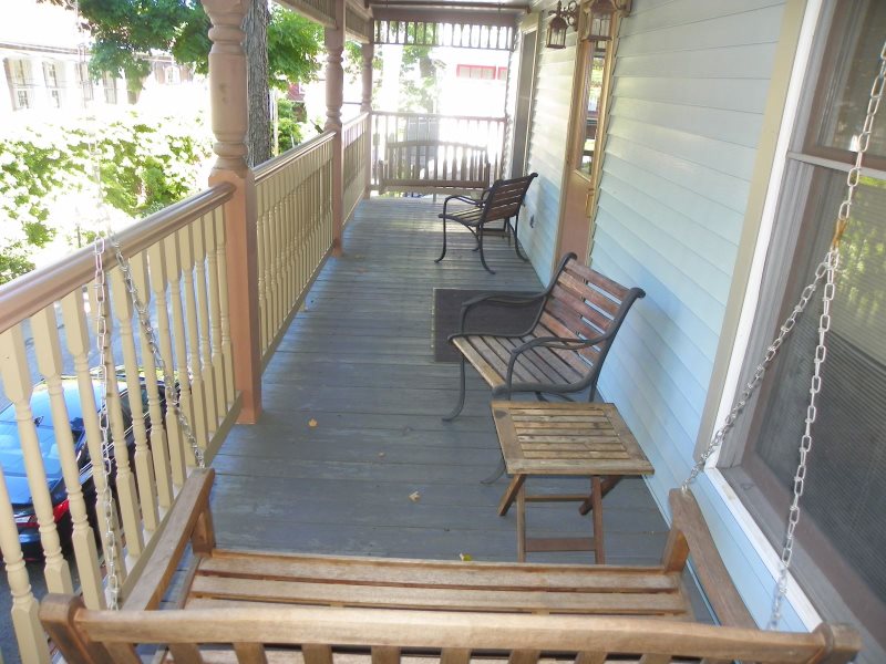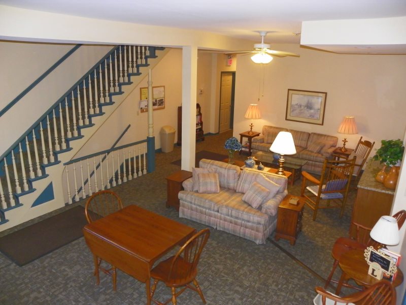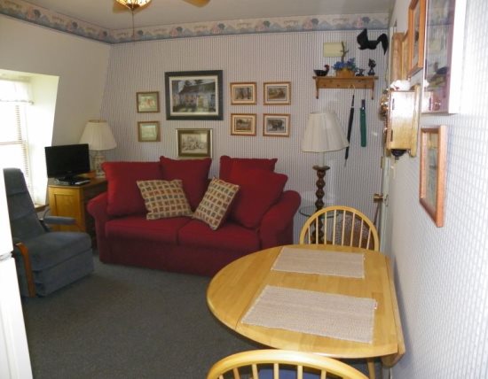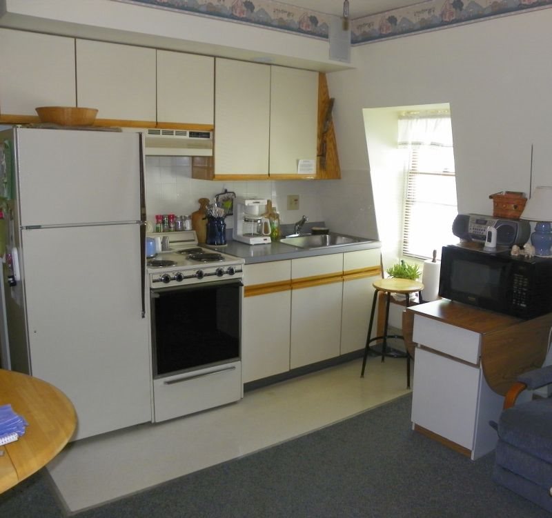 Combined living room with full-size sleeper sofa and kitchen with stove, refrigerator and microwave